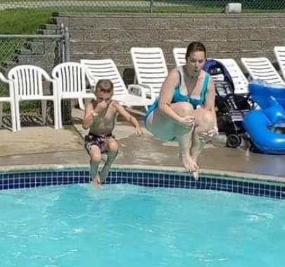 In these two years, I have developed new friendships, solid friendships, with women who are there to support each other in our physical fitness journeys as well as in our lives. I have gained confidence. This picture, of me jumping in the pool with my son, means the world to me. It was taken in the summer of 2019, my first summer with Cupcakes Anonymous. I finally was so comfortable in my own skin that I put on the damn bathing suit AND played with my son at a campground. I did Cannon Balls with him! It was one of the best experiences of my life!!! And I continue to be able to be present with my kids and my husband in ways I hadn’t been before.